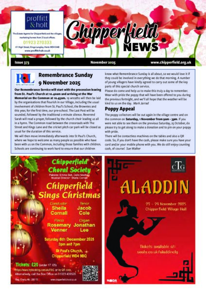 Each edition of Chipperfield News includes a village diary with details of the months events in the village, articles of interest, church notices and advertisements for local businesses and services.
