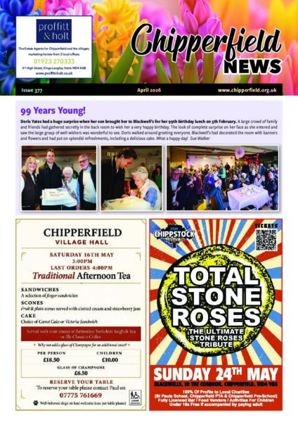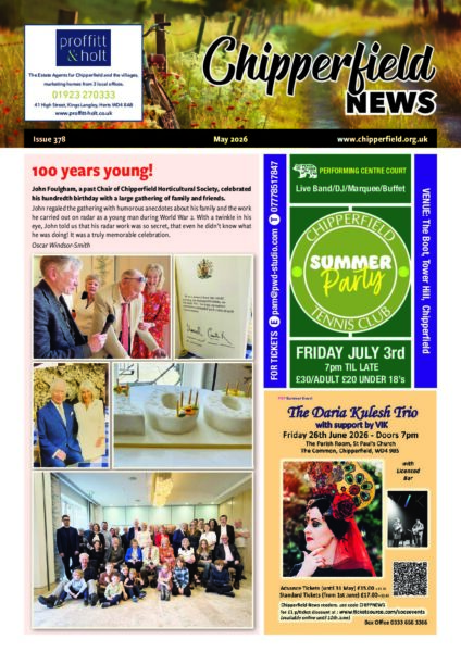 Each edition of Chipperfield News includes a village diary with details of the months events in the village, articles of interest, church notices and advertisements for local businesses and services.